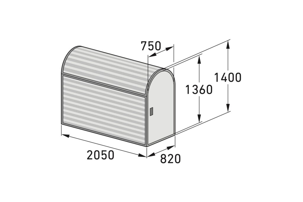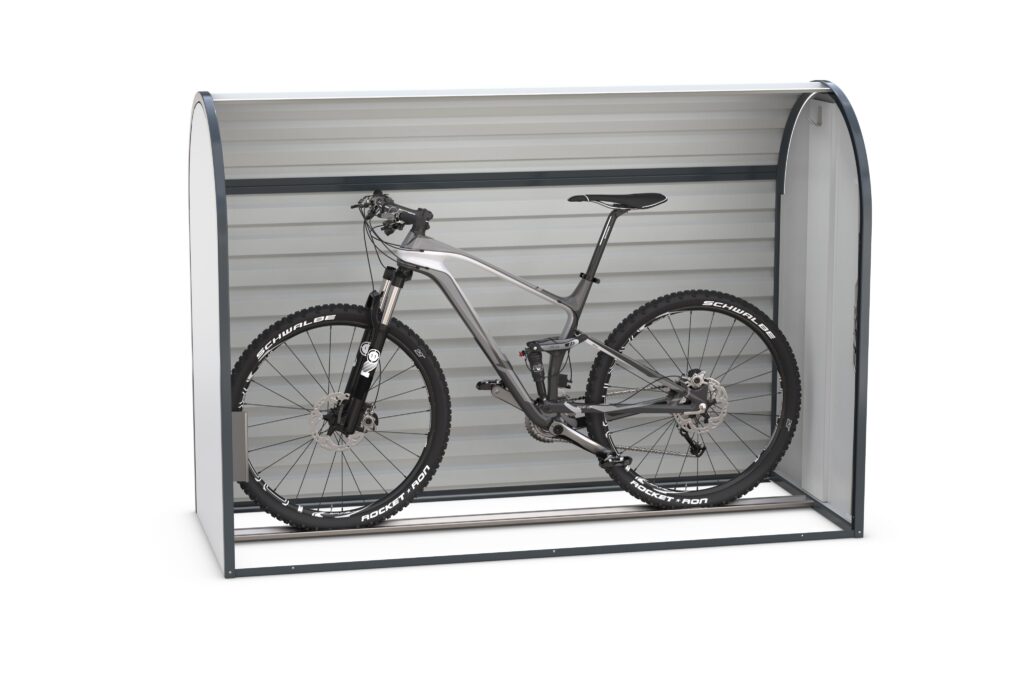 Zur Innenausstattung gehören eine Einstellschiene und ein Mehrzweckhaken. Ideal für den Einsatz an öffentlichen und privaten Standorten wie Schulen, Unternehmen, Wohnanlagen oder Bike-&-Ride-Stationen.