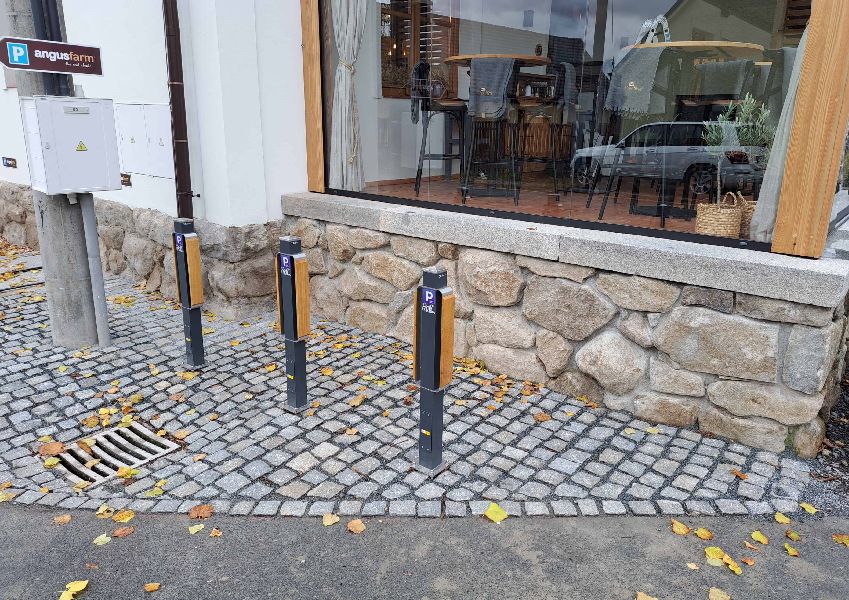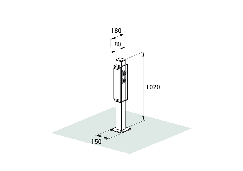 Die Stromzuführung wird innerhalb des Pfostens über einen separaten Versorgungskanal geführt und ist über eine Abdeckplatte mit den Maßen 150 × 300 mm zugänglich.