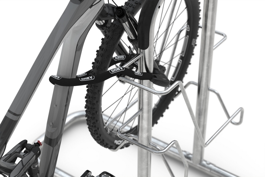 Der Anlehnbügel 6000 verfügt über eine zweiteilige Vorderradaufnahme, die das Fahrrad an vier definierten Kontaktpunkten sicher fixiert und dadurch einen besonders stabilen Stand gewährleistet. Integrierte Kunststoffelemente an den Kontaktflächen schützen den Fahrradrahmen zuverlässig vor Kratzern und Beschädigungen beim Einstellen.